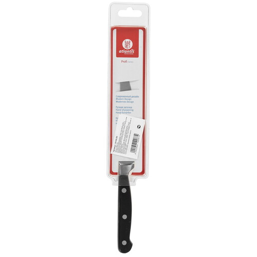 Кухонный нож Atlantis оснащен острым лезвием из нержавеющей стали. Пластиковая ручка удобна для удержания и проста в уходе. Кованая конструкция повышает прочность лезвия. Нож подходит для ручной чистки и мойки в ПММ.