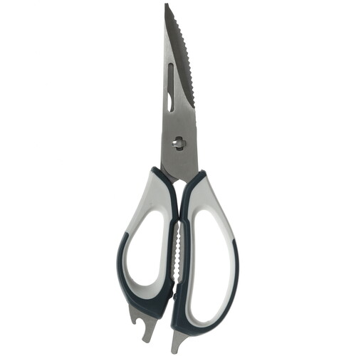 Ножницы кухонные SATOSHI Ривьера 882-404 имеют рукоять из пластика. Ручка легкая, надежно фиксируется в ладони и не холодит руку. В модели также есть орехокол, открывалка, скребок для чистки рыбьей чешуи.