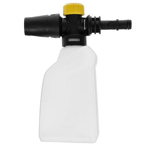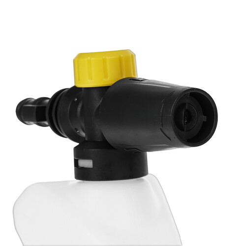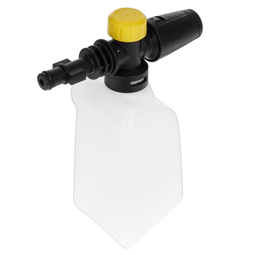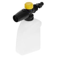Генератор пены Huter 71/5/12 предполагает использование при давлении на впуске до 160 бар. Для соединения с пистолетом аппарата высокого давления аксессуар оснащается быстросъемным штуцером диаметром 1 дюйм. Он выполняется в виде бутылки из полипропилена белого цвета. В емкость объемом 0.4 л заливается раствор автошампуня или другого специализированного моющего средства.
