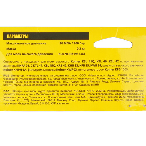 Пистолет Kolner KHPG 20МРа совместим с мойками высокого давления Kolner K195 LUX. Быстросъемное соединение облегчает подключение и замену насадки. Пистолет распыляет воду или моющий состав мощной струей для очистки пыли, грязи и других загрязнений с поверхностей.