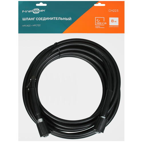 FinePower CH223 оснащен разъемами M22x1.5 для подключения мойки и пистолета-распылителя. Резиновые накладки на муфтах защищают от появления протечек при работе под сильным давлением. Шланг подходит для разных моделей моек и аппаратов высокого давления.