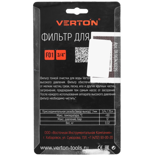 Фильтр для воды Verton F01 подходит для моек высокого давления. Устанавливается на входящий патрубок мойки размером 3/4". Фильтр обеспечивает очистку воды от мелких частиц грязи, песка, ила и других крупных частиц загрязнения, предохраняя тем самым насос от засорения. После каждого использования аппарата высокого давления фильтр необходимо чистить.