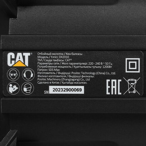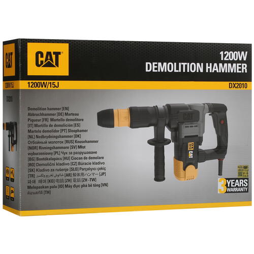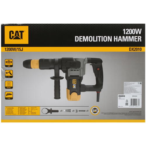 CAT DX2010 обладает мощностью 1200 Вт. Инструмент весом 4.9 кг удобен для выполнения работ на высоте. Он оснащен прорезиненной рукояткой, что не позволяет ему скользить в руках. Молоток удобно удерживать в любом положении благодаря компактному корпусу и антивибрационной конструкции. Для легкого управления используется спусковой крючок. Защитой шнура от перегибов и повреждений служит соединение шаровым шарниром.