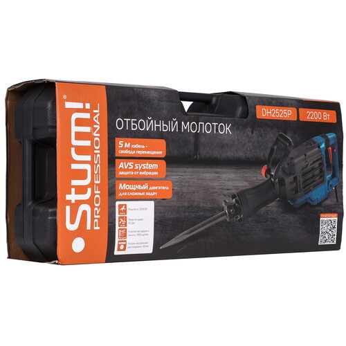 Благодаря использованию в отбойном молотке Sturm! DH2525P внутреннего шестигранника диаметром 30 мм с ним можно использовать различную оснастку. Пятиметровый морозостойкий кабель в прорезиненной изоляции позволит работать на удалении от розетки. Для удобного хранения электроинструмента в комплекте поставки предусмотрен кейс.