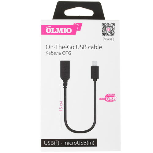 OTG-кабель Olmio – надежный аксессуар, позволяющий подключать к мобильному устройству периферийное оборудование и накопители памяти. Подключение клавиатуры или мыши позволит превратить смартфон в полноценное компьютерное устройство. Благодаря этому вы сможете набирать текст, используя смартфон и периферию.