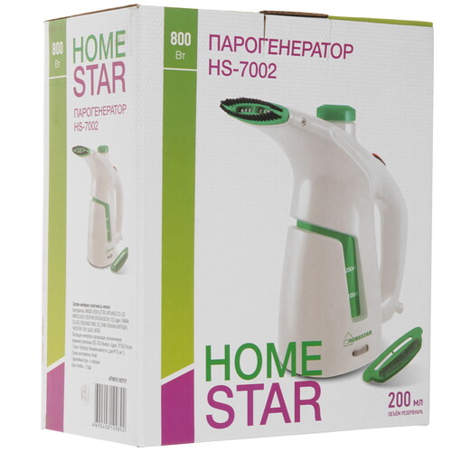 HOMESTAR HS-7002 комплектуется насадкой-щеткой для удаления пыли, шерсти, волос, а также насадка с подушечкой для проникновения пара глубоко в структуру ткани. Световой индикатор оповещает о готовности прибора приступить к работе. Непрерывная эксплуатация модели рассчитана на 15 мин. При подключении к сети используется 1.6-метровый кабель.