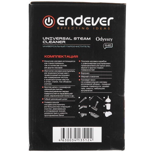 Прибор Endever Odyssey Q-443 поставляется с гибким удлиняющим шлангом, плоским скребком, конусной, изогнутой и универсальной насадками распыления, а также круглой щеткой с щетиной. Комплектация дополнена мерным стаканом, воронкой и тканевым чехлом. Оборудование действует при температуре нагрева 105°C, потоке пара 28 г/мин и давлении 3.5 Бар.