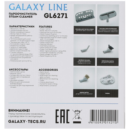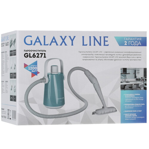 Galaxy Line GL 6271 использует для воды напольный бак объемом 300 мл, чего хватает на 12 минут непрерывной работы. Для подготовки к работе пароочиститель тратит 240 секунд. Благодаря насадке для отпаривания прибор можно использовать для ухода за одеждой, разглаживания складок на шторах, очистки мягкой мебели, дезинфекции игрушек. Безопасную эксплуатацию обеспечивает защита от перегрева, блокировка подачи пара. Модель содержит паровой шланг длиной 1.15 м и использует для переноски ручку.