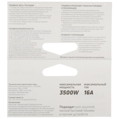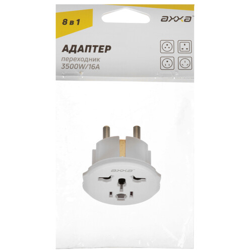 Переходник AXXA 2416 оснащен шестью вилками для подключения к сети разных типов устройств. Наличие заземления гарантирует безопасную работу приборов. Переходник подходит для подключения к сети 220 В и выдерживает предельную нагрузку 3500 Вт.