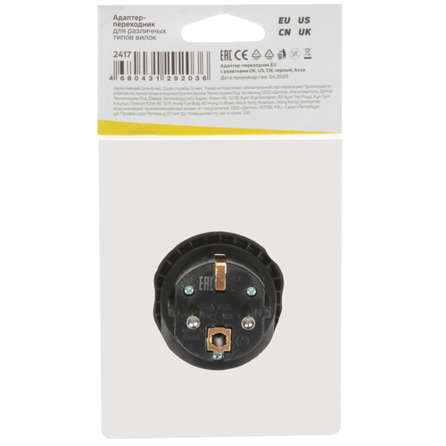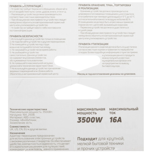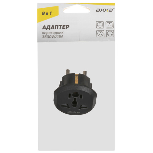Переходник AXXA 2417 оснащен шестью вилками для подключения к сети разных типов устройств. Наличие заземления гарантирует безопасную работу приборов. Переходник подходит для подключения к сети 220 В и выдерживает предельную нагрузку 3500 Вт.