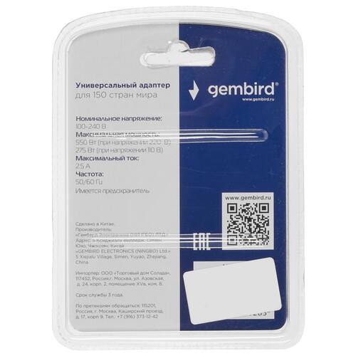 Универсальный переходник Gembird WTA-1 позволяет подключаться к электрической сети в более чем в 150 странах мира. Переходник оснащен розетками и вилками различных стандартов. Выдвижной механизм дает возможность подобрать необходимый тип вилки в зависимости от того в какой стране вы находитесь. Встроенный предохранитель обеспечивает надежную защиту подключенных устройств от короткого замыкания и перегрузки.