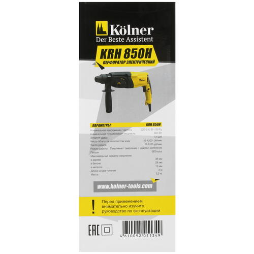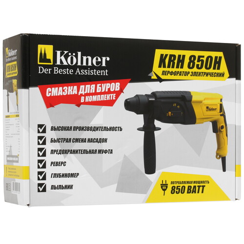 Система электронной регулировки частоты вращения/ударов помогает управлять интенсивностью вращения бура. Блокировка случайного включения повышает степень безопасности в эксплуатации инструмента. Из других особенностей Kolner KRH 850H отмечаются ограничитель глубины сверления, функция реверса и дополнительная рукоятка из нескользящего материала.
