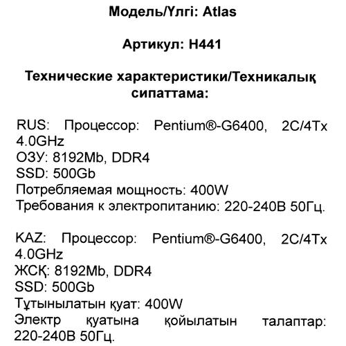 ПК DEXP Atlas H441 облачен в черный корпус с форм-фактором Mini-Tower и размерами 380x175x350 мм. На устройстве отсутствует предустановленная операционная система, чтобы вы могли самостоятельно установить нужный софт и удобную для вас ОС. 2-ядерный процессор Intel Pentium Gold G6400 с базовой частотой 4 ГГц и обработкой до 4 потоков вычислительных операций обеспечит стабильную работу устройства при запуске нересурсоемких программ. Для бесперебойной работы системы в режиме многозадачности имеется 8 ГБ оперативной памяти.