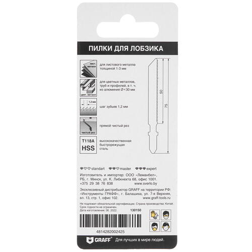Пилки GRAFF 130150 предназначены для реза цветного металла, алюминиевых профилей и труб диаметром до 80 мм. На полотне зубья расположены с шагом 1.2 мм, что обеспечивает чистый прямой рез. Оснастка разработана для электрического лобзика с Т-образным креплением. Общая длина пилки составляет 118 мм.