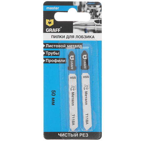 Пилка для лобзика GRAFF 130150 ‒ надежная оснастка для работ по металлу. В комплект входят 2 пильных полотна с рабочей длиной 50 мм. Оснастка изготовлена из быстрорежущей стали, что повышает ее ресурс.