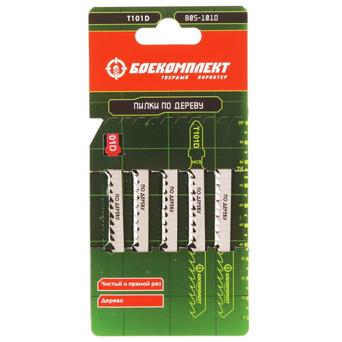 Пилки для лобзика БОЕКОМПЛЕКТ B05-101D производят чистый прямой рез. Установка полотен производится с помощью Т-образного хвостовика. Общая длина пилок равна 100 мм, а рабочая длина – 74 мм.
