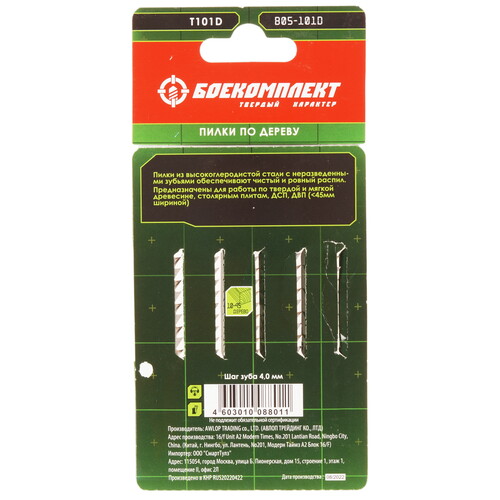 Пилки для лобзика БОЕКОМПЛЕКТ B05-101D предназначены для работы с ДВП, ДСП, деревом, пластмассой и фанерой. В комплект входят 5 полотен типа T101D.