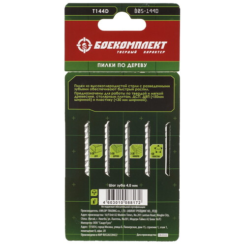 Пилки для лобзика БОЕКОМПЛЕКТ B05-144D производят быстрый прямой рез. Установка полотен производится с помощью Т-образного хвостовика. Общая длина пилок равна 100 мм, а рабочая длина – 74 мм.