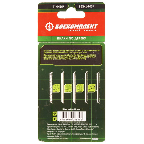 Пилки для лобзика БОЕКОМПЛЕКТ B05-144DP производят быстрый прямой рез. Установка полотен производится с помощью Т-образного хвостовика. Общая длина пилок равна 100 мм, а рабочая длина – 74 мм.