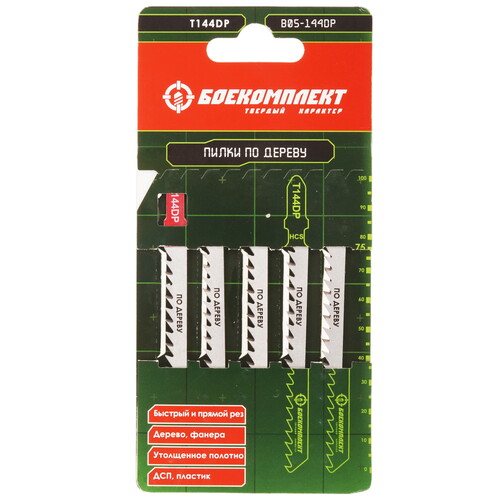 Пилки для лобзика БОЕКОМПЛЕКТ B05-144DP предназначены для работы с ДСП, деревом, пластмассой и фанерой. В комплект входят 5 полотен типа T144DP.