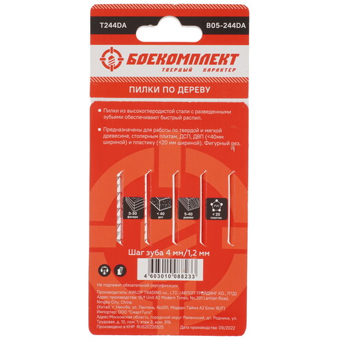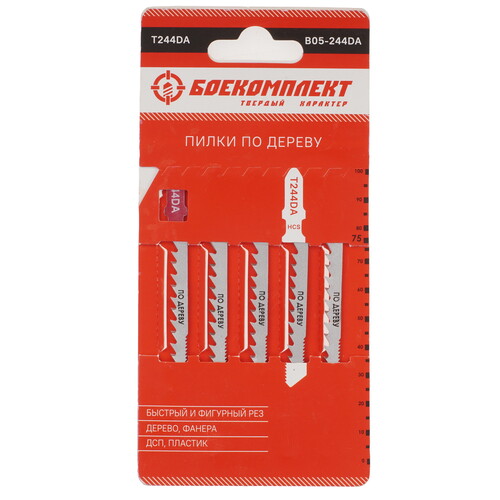 Пилки для лобзика БОЕКОМПЛЕКТ B05-244DA производят быстрый фигурный рез. Установка полотен производится с помощью Т-образного хвостовика. Общая длина пилок равна 100 мм, а рабочая длина – 74 мм.