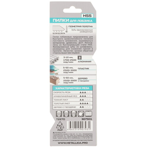 Пилки для лобзика METALLICA Optima T227D предназначены для криволинейного пиления листового алюминия, профилей, полимерных материалов.