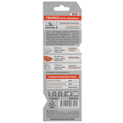 Пилки алмазные METALLICA Ultra T150DIA предназначены для пиления мягкой облицовочной глазурованной плитки, абразивных пластиков при производстве локальных работ. Ограниченно подходят для напольной плитки средней твёрдости.