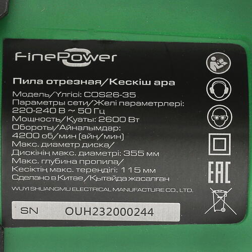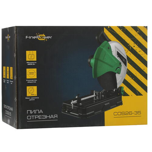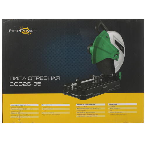 Пила отрезная FinePower COS26-35 благодаря частоте вращения 4200 об/мин обеспечивает эффективное пиление заготовок из металла и других материалов. В качестве режущей оснастки применяется диск диаметром 355 мм. Максимально допустимая глубина пропила составляет 115 мм. Металлическая конструкция с устойчивой опорой и защитным кожухом гарантирует надежность в эксплуатации инструмента. Для удобного управления диском предусмотрена эргономичная пластиковая рукоятка. FinePower COS26-35 функционирует от электросети и оборудована кабелем длиной 2 м.