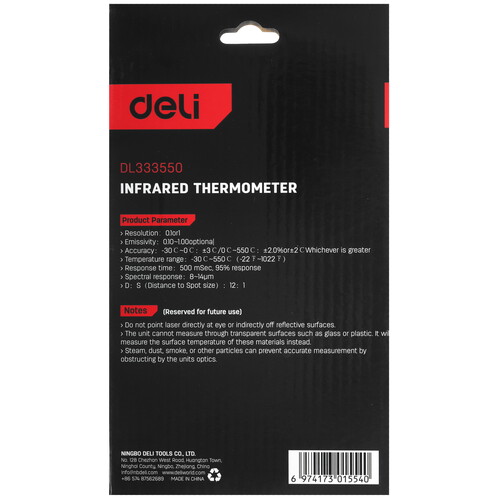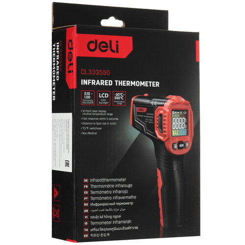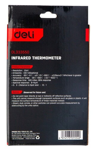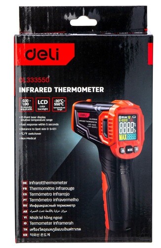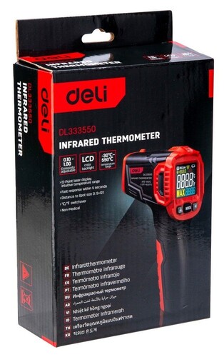 Инфракрасный пирометр Deli DL333550 – прибор для точных бесконтактных измерений температуры. Эта надежная модель с цветным дисплеем от проверенного производителя сочетает в себе простоту использования и функциональность.