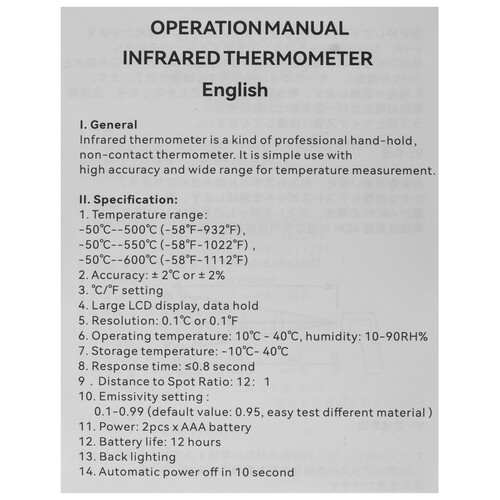 от -50 °C до 530 °C, дисплей, питание - батарейки