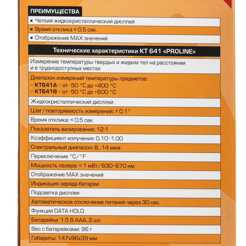 Цифровой пирометр KT 641A – решение для бесконтактного измерения температуры. Этот надежный прибор от проверенного производителя обеспечивает точность и удобство в работе. Эргономичный дизайн и интуитивное управление делают его незаменимым помощником для профессионального и бытового использования.