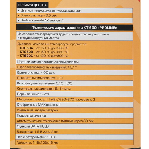 Цифровой пирометр KT 650C – решение для бесконтактного измерения температуры. Этот надежный прибор от проверенного производителя обеспечивает точность и удобство в работе. Эргономичный дизайн и интуитивное управление делают его незаменимым помощником для профессионального и бытового использования.