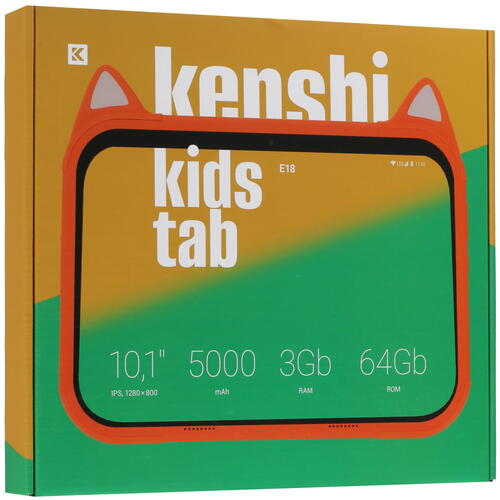 Планшет KENSHI Kids E18 LTE 64 ГБ с экраном диагональю 10.1" обеспечивает комфорт при просмотре видео, в обучающих и развлекательных приложениях для детей. Он выполнен в оранжевом корпусе с образом тигра и декоративными ушками. Благодаря панели IPS с разрешением 1280x800 пикселей передается четкая картинка с насыщенными оттенками. Все программы запускаются и работают без задержек благодаря процессору Unisoc Tiger T310 и 3 ГБ оперативной памяти. Объем встроенной памяти 64 ГБ можно увеличить с помощью карты micro SD емкостью до 256 ГБ.