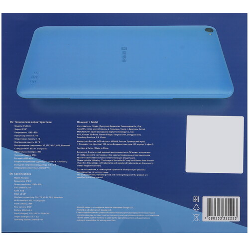 Основные элементы конфигурации планшета KENSHI Pad Lite E48 LTE 64 ГБ – 4-ядерный процессор Unisoc Tiger T310 и 4 ГБ оперативной памяти. Их производительность позволяет одновременно использовать без сбоев и зависаний несколько приложений. 64-гигабайтная встроенная память устройства расширяется с помощью карты microSD с объемом до 256 ГБ. Планшет получает питание от аккумулятора с емкостью 4000 мА·ч и работает автономно в режиме просмотра видео до 5.5 ч.
