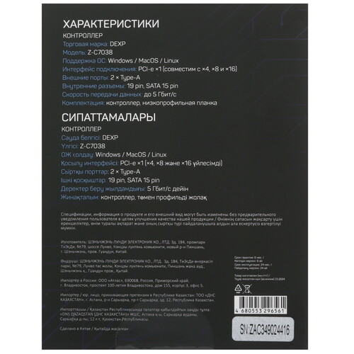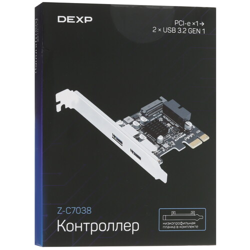 Интерфейс подключения платы расширения DEXP Z-C7038 – PCI-E x1. Для установки устройства также подходят слоты PCI-E x4, PCI-E x8 и PCI-E x16. Плата совместима с компьютерами под управлением операционных систем Windows, macOS и Linux.