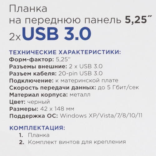 Плата расширения Gembird FP5.25-USB3-2A имеет прочный металлический корпус. Устройство монтируется без зазоров с помощью комплектных крепежных винтов. Цвет платы классический – черный. Внешний вид устройства гармонично сочетается с дизайном подавляющего большинства корпусов. Поддерживаемые операционные системы – Windows XP, Vista, 7, 8, 10 и 11.