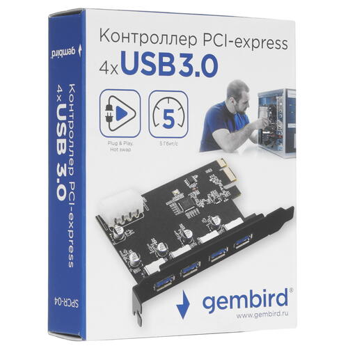 Плата расширения Gembird SPCR-04 – отличный выбор для компьютерных энтузиастов и профессиональных пользователей ПК. Устройство позволяет получить 4 дополнительных порта USB. Существующие USB-порты при этом не теряются: плата устанавливается в слот расширения PCI-E. Устройство рассчитано на использование интерфейса PCI-E x1. Плату также можно смонтировать в один из слотов других типов – PCI-E x4, PCI-E x8 или PCI-E x16. Внутренний разъем Molex подходит для питания дополнительного оборудования.