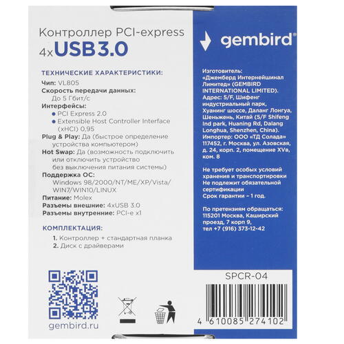 Плата расширения Gembird SPCR-04 поддерживает стандарт USB 3.2 Gen1. Пропускная способность USB-подключений ограничена значительными 5 Гбит/с. Плата полностью раскрывает потенциал скоростных внешних накопителей. Она может использоваться для подключения любых устройств, рассчитанных на подсоединение к USB-порту типа A. Плата укомплектована диском с программным обеспечением. Поддерживаемые операционные системы – Windows 98, 2000, NT, ME, XP, Vista, 7, 10, а также Linux.