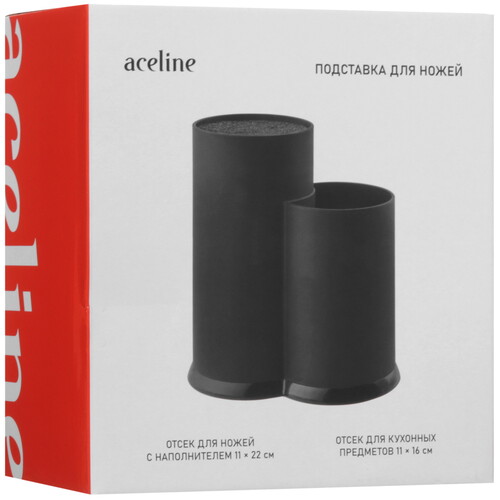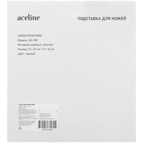 Подставка для ножей AV-100 выполнена в пластиковом корпусе с наполнителем из волокон. Высота аксессуара вмещает лезвия длиной до 20 см. В подставке есть отсек для кухонных предметов с размерами 16x11 см.