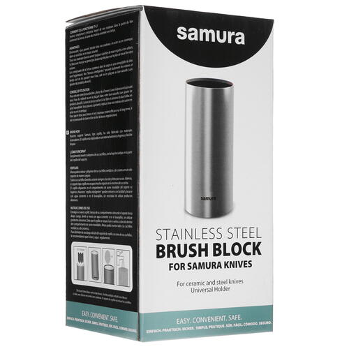 Подставка для ножей Samura KBM-100/K – универсальное приспособление для безопасного хранения ножей. Она обладает корпусом из нержавеющей стали с гладкой практичной поверхностью и специальной щеткой внутри. Наполнитель из множества волокон гарантирует простую и прочную фиксацию ножей. Он защищает клинки от неблагоприятных воздействий и контакта друг с другом. Подставка Samura KBM-100/K предусматривает размещение от 5 до 11 ножей одновременно в зависимости от размера клинка. Среди преимуществ – компактные размеры.