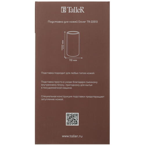Подставка для ножей TalleR TR-22513 – универсальное приспособление для хранения ножей. Она обладает корпусом из полипропилена с матовой практичной поверхностью и специальной щеткой внутри. Съемный наполнитель из множества волокон гарантирует простую и прочную фиксацию ножей. Он защищает клинки от неблагоприятных воздействий и контакта друг с другом. Подставка TalleR TR-22513 предусматривает размещение от 5 до 10 ножей в зависимости от размера лезвия. Среди преимуществ – возможность очистки наполнителя в посудомоечной машине.