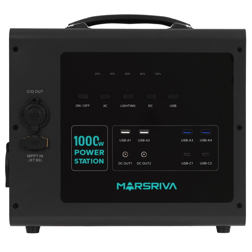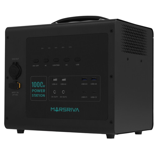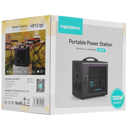 Портативная зарядная стенция MARSRIVA MP10 обеспечивает эффективную выходную мощность 1000 Вт. Для подключения нагрузки используются 2 разъема DC и 2 евророзетки. Зарядка и питание портативных устройств осуществляются через порт USB. ИБП рассчитан на эксплуатацию при температуре от -20 до 45 °C.