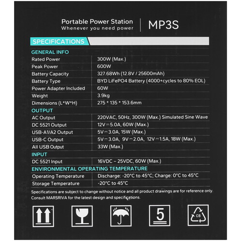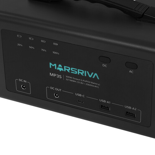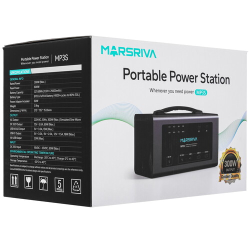 портативная зарядная станция MARSRIVA MP3S обеспечивает эффективную выходную мощность 300 Вт. Для подключения нагрузки используются разъем DC и 2 евророзетки. Зарядка и питание портативных устройств осуществляются через порт USB. ИБП рассчитан на эксплуатацию при температуре от -20 до 45 °C.
