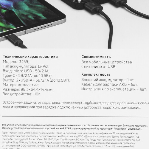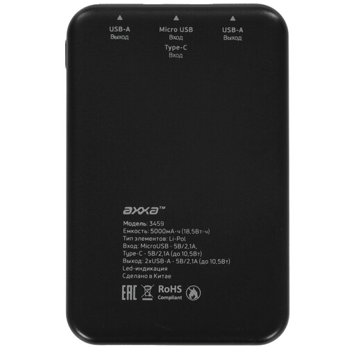 Портативный аккумулятор AXXA 3459 допускает одновременную зарядку двух устройств через разъемы USB Type-A. Батарея действует с выходным напряжением 5 В и током 2.1 А. Модель поддерживает зарядку через порты USB Type-C и microUSB.