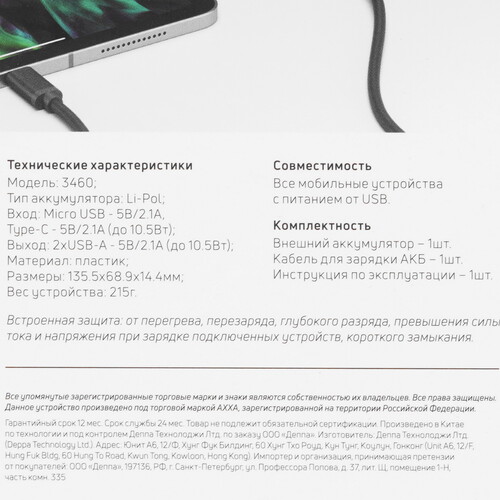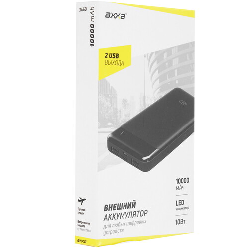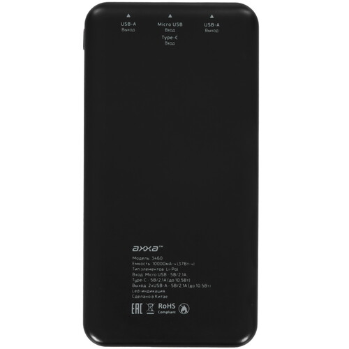 Портативный аккумулятор AXXA 3460 допускает одновременную зарядку двух устройств через разъемы USB Type-A. Батарея действует с выходным напряжением 5 В и током 2.1 А. Модель поддерживает зарядку через порты USB Type-C и microUSB. Устройство дополнено защитой от глубокого разряда, короткого замыкания и других сбоев.