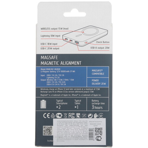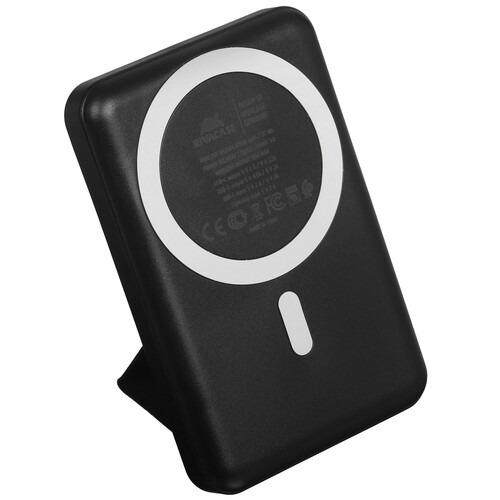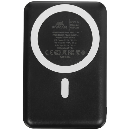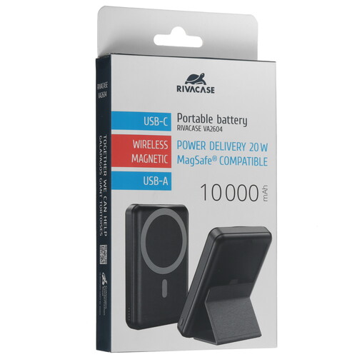 В черный корпус портативного аккумулятора RIVACASE VA2604 заключен литий-полимерный аккумулятор емкостью 10000 мАч, который обеспечит 1-2 полные зарядки аккумулятора вашего смартфона. Особенностью модели стала поддержка беспроводной зарядки мощностью 15 Вт, а встроенный магнит позволит зафиксировать ее на корпусе мобильного устройства с поддержкой технологии MagSafe. К портативному аккумулятору RIVACASE VA2604 также можно подключиться по проводу при помощи выходных разъемов USB Туре-А и USB Туре-С. Для удобного процесса беспроводной зарядки модель предусматривает выдвижную подставку.