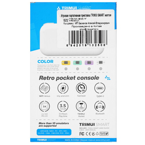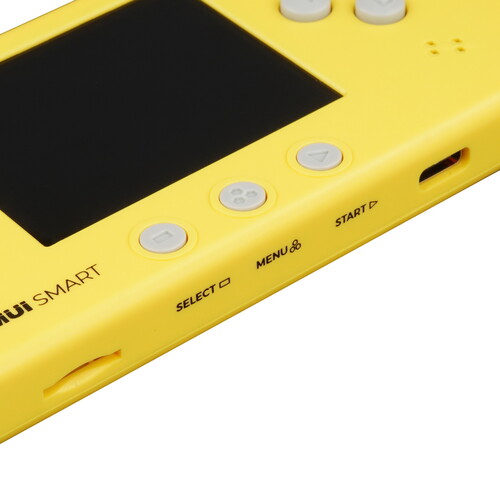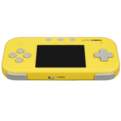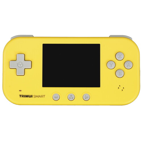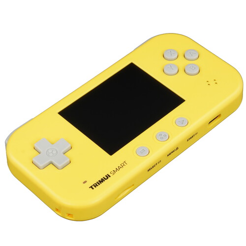 Портативная игровая консоль TRIMUI SMART работает на обновляемой прошивке TRIM и совместима с ретро-платформами. Она выполнена в корпусе желтого цвета. На передней и боковых панелях расположены элементы управления.