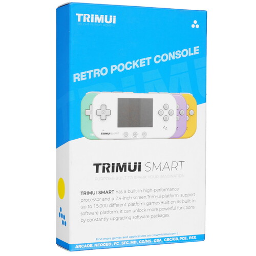 В игровой консоли установлен 2.4-дюймовый цветной экран. Наличие слота microSD предусматривает увеличение памяти хранилища. В устройстве реализованы беспроводные интерфейсы Wi-Fi и Bluetooth. Одного заряда встроенного аккумулятора хватает до 3.5 часов автономной работы портативной консоли TRIMUI SMART.