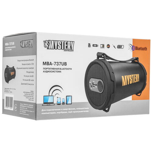 Аксессуар работает от одного заряда на протяжении 4 ч. Mystery MBA-737UB сочетает в себе AUX-вход, слот для MicroSD-карты и разъем USB Type-A. Боковая стенка корпуса содержит панель управления. FM-тюнер позволяет наслаждаться композициями с различных радиостанций.