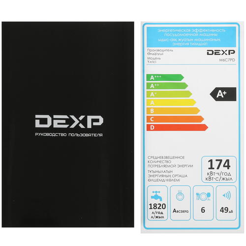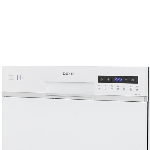 У DEXP M6C7PD 7 программ мойки, среди которых стандартная, экономичная, быстрая, интенсивная для сильно загрязненной посуды, деликатная для хрусталя и тонкого стекла, замачивание для удаления присохших остатков пищи и половинная загрузка. За один обычный цикл машина расходует всего 5 л воды – гораздо меньше, чем понадобилось бы, чтобы вымыть такое количество стаканов и тарелок вручную.